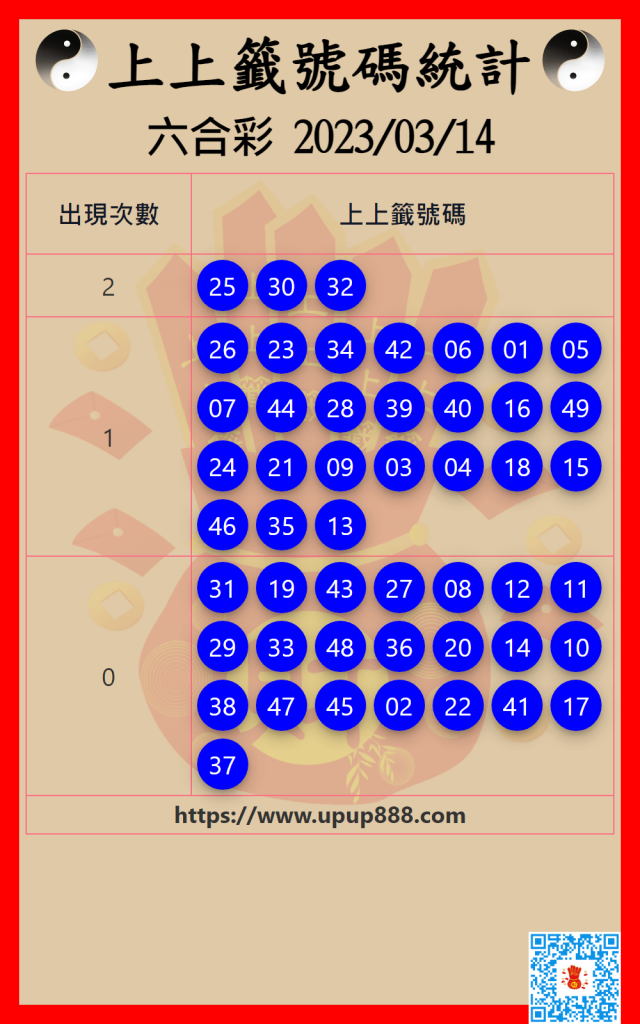 六合彩上上籤號碼統計 3/14