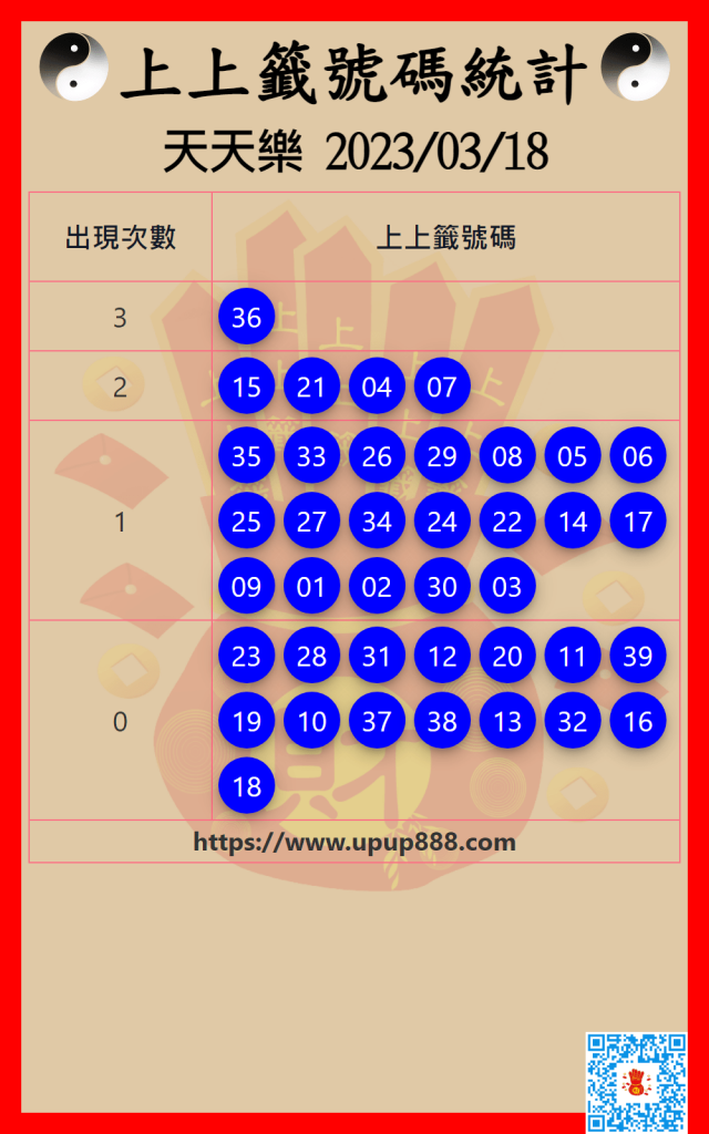 天天樂上上籤號碼統計 3/18